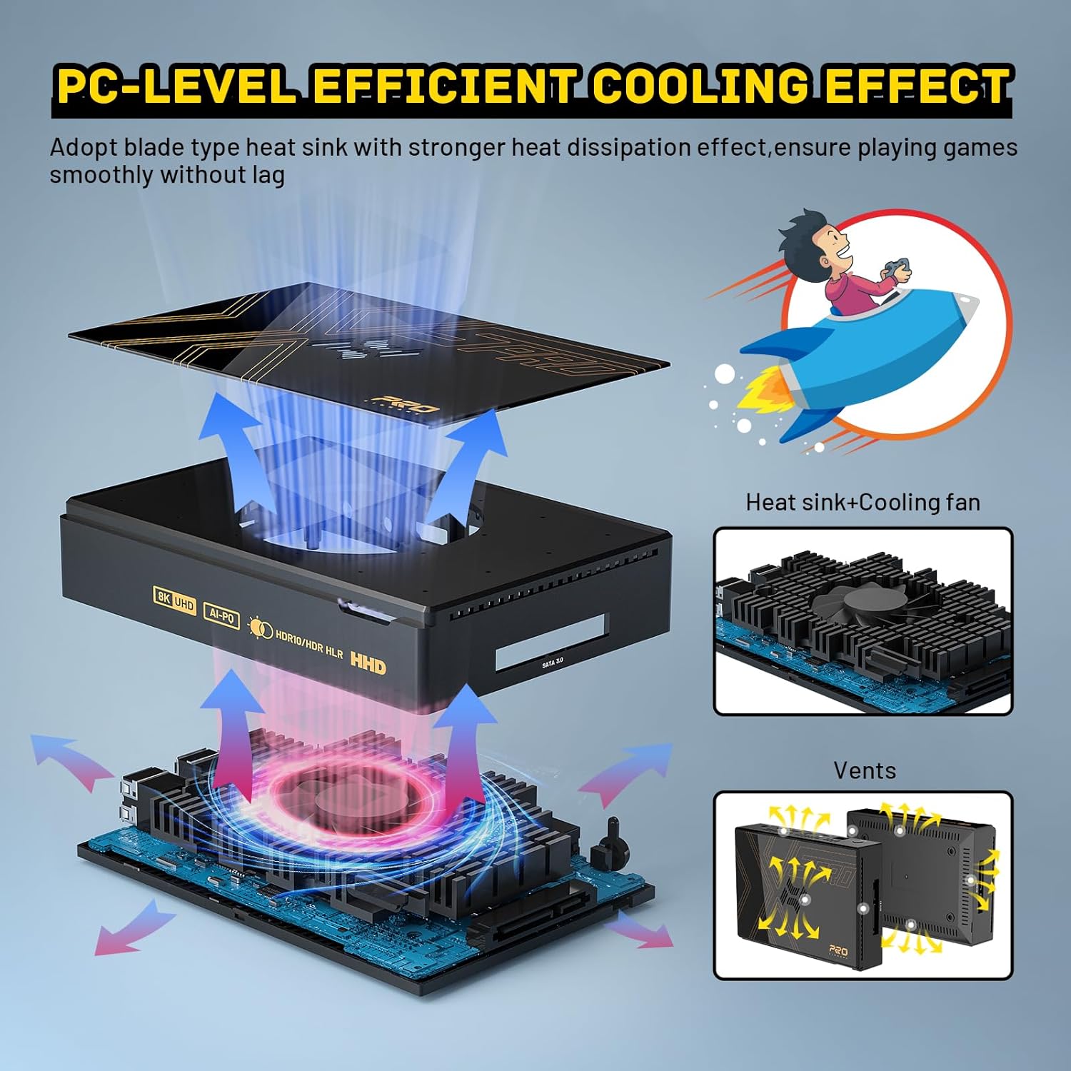 • 【Advanced Cooling System】A built-in silent cooling fan activates during use, maintaining optimal temps (40–60°C / 104–140°F) to prevent overheating, frame drops or lag—guaranteeing smooth gameplay and movie nights.